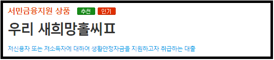 우리은행 새희망홀씨2 대출 - 서민 생계자금 대출은 저신용자 또는 저소득자에 대하여 생계자금을 지원하고자 취급하는 대출로 서민금융 지원을 위한 신용대출상품입니다.