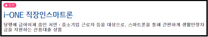 기업은행 직장인 신용대출은 기업은행에 급여를 이체 중인 서민, 중소기업 근로자 등을 대상으로, 스마트폰을 통해 간편하게 생활안정자금을 지원하는 'i-ONE 직장인스마트론' 신용대출 금융 상품으로 영업점 방문 없이 스마트폰(i-ONE뱅크 앱)을 통해 간편하게 지원할 수 있는 특징이 있습니다.