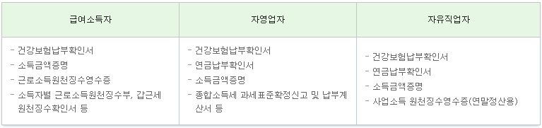 - 급여소득자: 건강보험자격득실확인서, 국민연금가입자 가입증명, 재직회사 발행 재직증명서 등