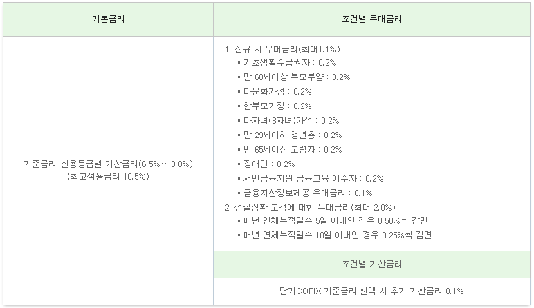 - 3개월 CD유통수익률 기준 : 최저 연 6.50% 부터~ - COFIX신규 기준 : 최저 연 6.66% 부터~ - 신잔액기준COFIX(3개월) 기준 : 최저 연 6.78% 부터~ - 단기COFIX 기준 : 최저 연 6.63% 부터~ |