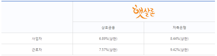 수협 햇살론 이자율(금리)에 대해서 알아보도록 하겠습니다. 현재 수협 이자율은 사업자 연 6.89% 상한, 근로자 연 7.57%의 상한을 두고 자율적으로 결정하도록 되어 있기 때문에 햇살론을 신청하려는 수협 영업점을 방문하여 정확한 적용 금리를 확인해야할 필요가 있습니다.
