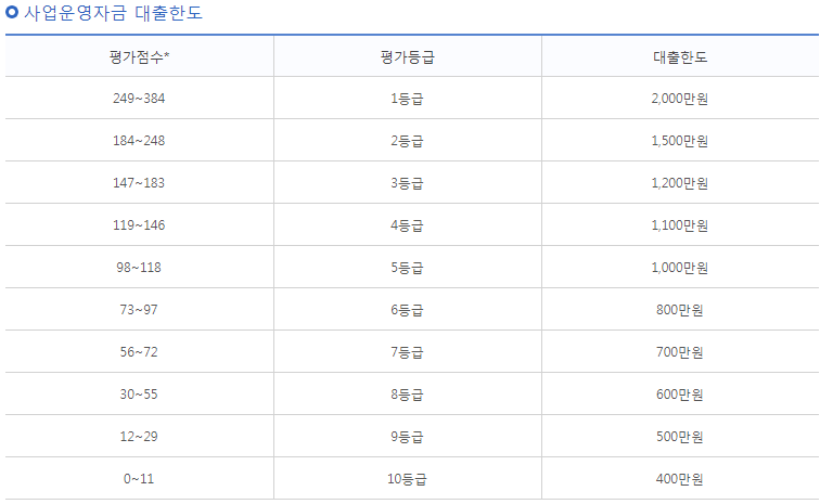 - 최고 2천만원 한도 내에서 '햇살론 소상공인 평가표'에 의해 평가된 점수별 평가등급에 따라 대출가능