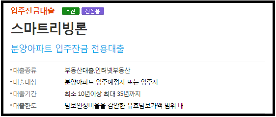 분양아파트에 대한 입주잔금을 위한 전용대출로서 이를 신청하기 위한 자격으로는 분양아파트 입주예정자 또는 입주자로서, 분양계약서상의 명의인(적법한 권리승계인, 공동명의인 포함)일 경우 신청을 하실 수 있습니다.