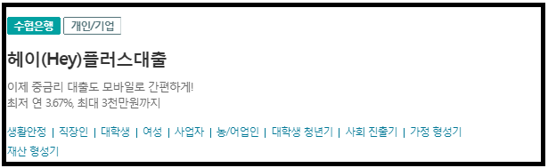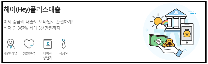 안녕하세요 모카도톨입니다. 이번 시간에는 수협 중금리 대출인 '헤이플러스 대출'에 대해서 알아보려고 합니다. 수협 헤이플러스 대출은 최근부터 트렌드가 되어가는 언택트 대출이라는 특징이 있는데요, 별도로 수협 영업점을 방문하지 않더라도 비대면으로 모바일을 통해 대출 신청과 실행을 할 수 있다는 장점이 있습니다. 또한 개인은 물론이고 사업자 부터 기업인 그리고 대학생까지 대출 이용을 할 수 있으니 한번 확인해 보시기 바랍니다.