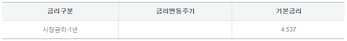 하나은행 무직자 대출의 이자율(금리)에 대해서 알아보도록 하겠습니다. 이자율(금리)는 대출금액 3백만원, 대출기간 1년, 당행 신용등급 3등급을 기준으로 하여 기본금리가 연 4.537%로 정해지고 있습니다.
