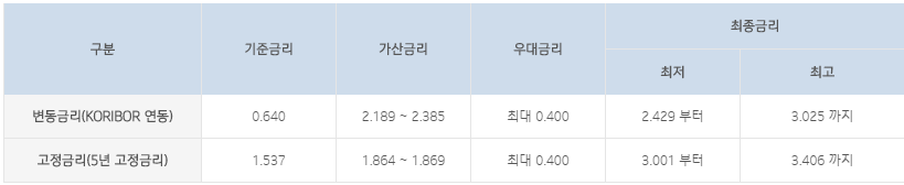 기업은행 주택담보대출 이자율(금리)에 대해서 알아보도록 하겠습니다. 이자율(금리)은 대출금 2억원, 대출만기 35년, 비거치식/분할상환방식, 변동금리 3개월물, 최초 5년 고정금리 적용 후 변동금리를 기준으로 하여 최저금리 연 2.429%에서 최고금리 연 3.406%로 산정되고 있습니다.