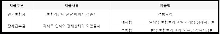 장해급부금은 재해로 인해 장해 상태가 되었을때 지급사유로 예치형은 [일시납 보험료의 20% x 해당 장해지급률]로 계산하여 보험금을 지급하며, 적립형의 경우 [월납 보험료의 20배 x 해당 장해지급률]로 계산되어 보험금을 지급하고 있습니다.