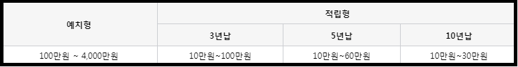 보험료는 예치형의 경우 100만원에서 4,000만원 사이이며, 적립형의 경우 만기기간에 따라서 3년납은 10만원~100만원, 5년납은 10만원~60만원, 10년납은 10만원~30만원의 한도로 정해져 있습니다.