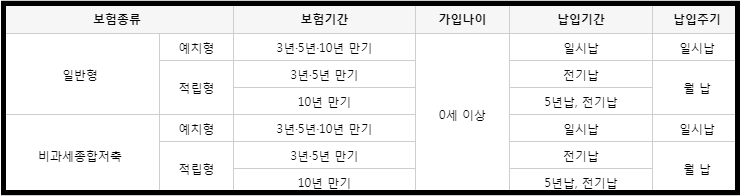 우체국 저축보험은 일반형과 비과세종합저축형으로 나누어지며 가입은 0세부터 가능합니다. 만기기간은 예치형과 적립형별로 최소 3년에서 최대 10년 만기로 약정하며, 납입기간은 일시납, 전기납, 5년납 등으로 나뉘어 지고 있습니다.