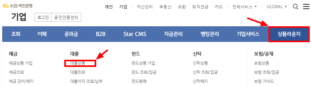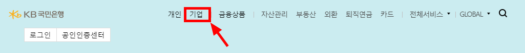 국민은행 홈페이지에서 기업 항목으로 들어갑니다.