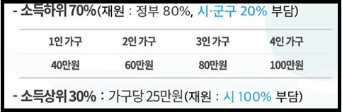 인천시 긴급재난지원금은 소득하위 70%에게 정부 80%와 시/구군 20%의 부담으로 지원금을 지원하고, 소득 상위 30%에게는 가구당 25만 원을 인천시 100%로 부담으로 지원함으로써 소득에 따른 지원을 두고 소외층을 없애는 것을 목표로 하고 있습니다. 때문에 본인이 고소득에 포함될 경우라도 최소 25만 원을 지급받을 수 있으니 꼭 챙기시기 바랍니다.