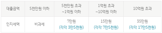 「인지세법」에 의해 대출약정 체결을 할 때 납부하는 세금으로 대출금액에 따라 세액이 차등 적용되며, 각 50%씩 대출자와 은행이 부담해야 합니다.