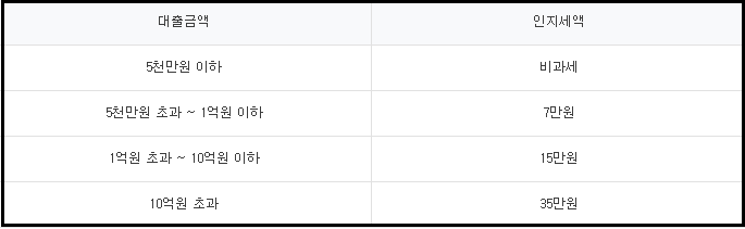 인지세법에 의해 대출약정 체결시 납부하는 세금으로 대출금액에 따라 세액이 차등 적용되며, 은행과 고객이 각 50%씩 부담해야 합니다.
