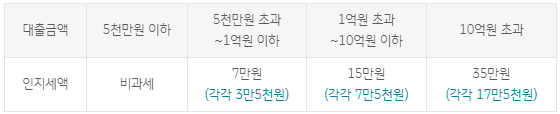 -인지세 : 「인지세법」에 의해 대출약정 체결을 할 때 납부하는 세금으로 대출금액에 따라 세액이 차등 적용되며, 각 50%씩 고객과 은행이 부담