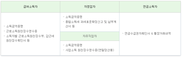 - 급여소득자: 건강보험자격득실확인서, 국민연금가입자 가입증명, 재직회사 발행 재직증명서 등
